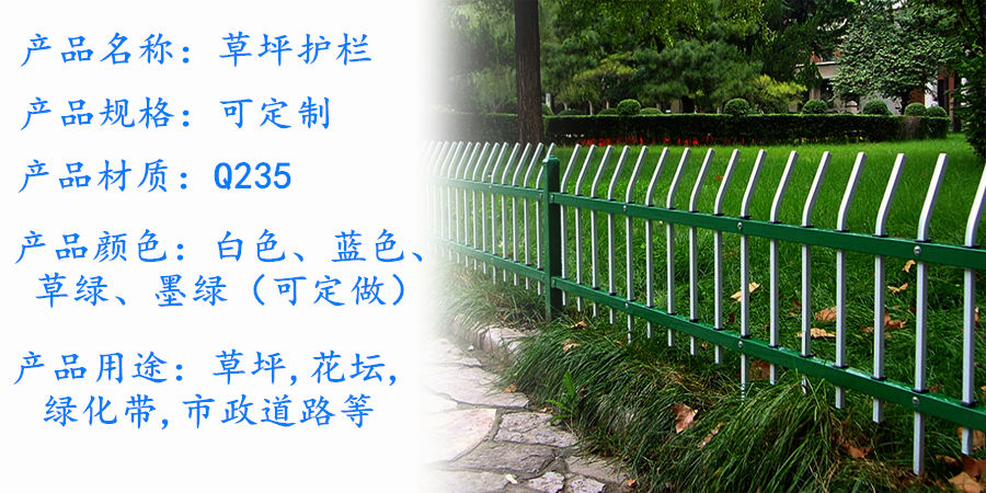 草坪护栏外型美观、色泽鲜艳、不褪色、坚固耐用,抗冲击强度高。耐候性好,耐高温、抗高寒、耐盐雾、抗潮湿、免维修、易清洗、使用寿命长、一次性投入,可享用终生。